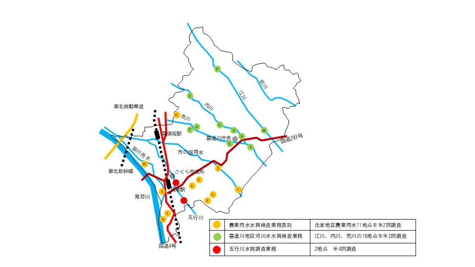 ※五行川水質調査連絡協議会では年4回、さくら市から筑西市までの流域的な調査を実施しています。さくら市内は2地点を調査しています。