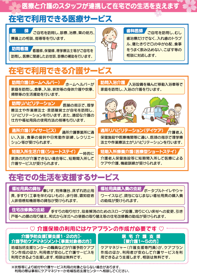 住み慣れた地域でいきいきと暮らし続けられるよう市内の医療機関や介護事業所の一覧と地図上での位置、在宅医療や介護サービスに関する情報を掲載した「さくら市在宅医療・介護マップ」を配布しておりますのでご活用ください。